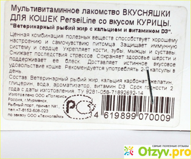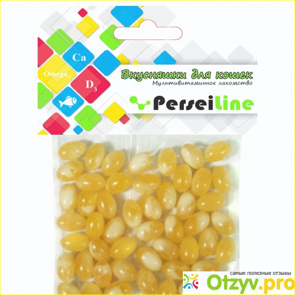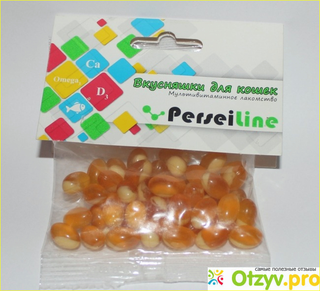 Что меня привлекло в лакомстве Perseiline? Необычный внешний вид, а также описание на упаковке. Ведь, как заверяет производитель, в этих гранулах содержится рыбий жир с кальцием и витамин D3. Это необходимые вещества для укрепления костей и зубов. И, если кошка живет в доме, не выходит на улицу, то у нее может быть нехватка витамина D3, синтезируемого под действием солнечных лучей. Вследствие чего со временем разрушается костная ткань, ослабевают мышцы и суставы становятся менее гибкими и прочными.