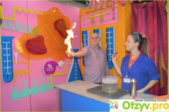Другой же зал, наоборот, очень светлый. И проводят тут уже "химические опыты". Все они безопасные для зрителей и участников. Но выглядят эффектно. Вот, например, поджигание моего мужа.