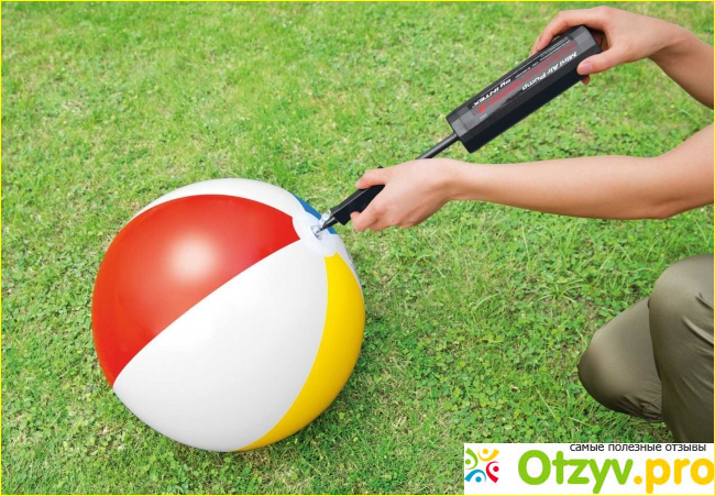 Мяч большой, но очень быстро надувается. Мы воспользовались насосом от надувного матраса, с ним накачивать любые надувные игрушки можно ещё быстрее.