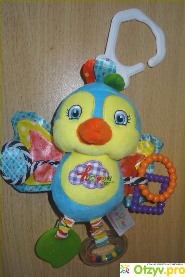 Увидела такую игрушку в магазине, показалось ничего удивительного в ней нет, кроме высокой цены, решила купить для коляски, там есть специальный крючок толстый пластмассовый, специально предусмотрено сделанный, чтобы деток не повредить и острых углов нет. Игрушка идет от нуля лет. Когда принесла домой, дала малышу поиграть, ему как раз три месяца, когда они начинают уже что-то лепетать. Он был в восторге от того, что на игрушке крылья шуршат, как полиэтиленовый пакет, он их просто мял, колечки, одно оранжевое, другое фиолетовое-это приспособление для десен и у деток которых начали расти зубы, уж очень ему понравилось. Есть погремушка в колесике, в нем пять шариков, хорошо все сделано, листочек на ощупь мягкая резина, зеркало из фольги, ножки из гладкой мятой ткани, глазки прошитые. Сделано из качественной мягкой ткани, ниток не торчит, нет бусинок, острых углов. Ребенок просто счастлив, игрушка развивает, когда трогает ее, ребенок начинает что-то говорить себе под нос. Отличная игрушка будет для Вашего ребенка. И на коляску можно подвесить, они же все любят рассматривать.