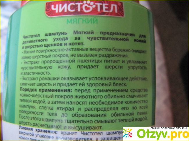 Всю информацию о составе мягкого шампуня для котят и щенков "Чистотел" можно легко прочитать на оборотной стороне флакона.