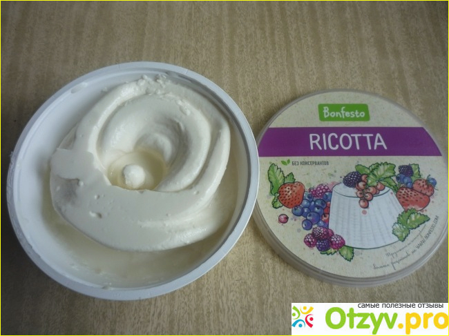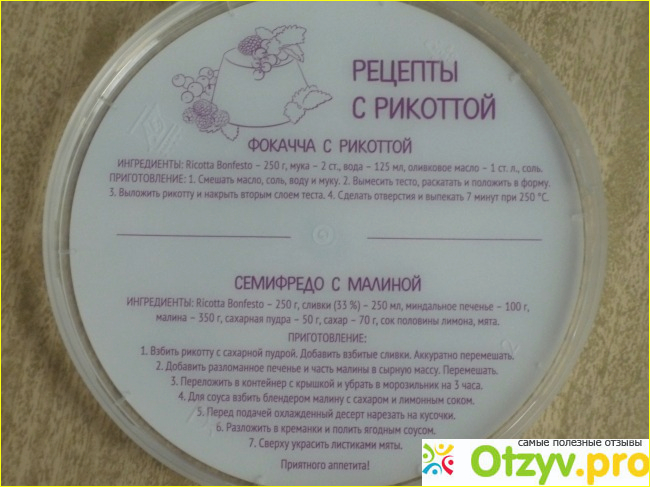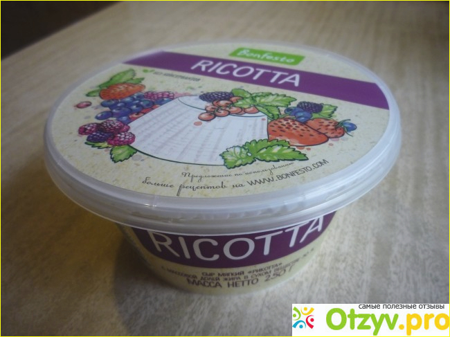 Здесь же размещена информация об энергетической ценности и условиях хранения мягкого сыра “Рикотта”.