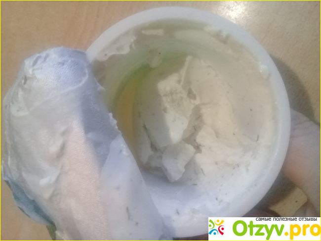 При вскрытии из емкости с сыром вытекло немного воды, рассола. Консистенция плотная, намазывается хорошо, не скатывается.