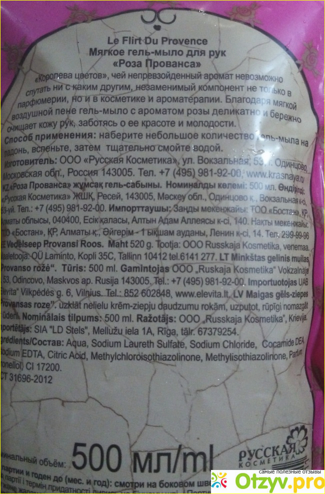 Мыло "Роза Прованса" не сушит кожу, пенится умеренно и что мне нравится, очень быстро и просто вымывается с рук. Срок годности после открытия - 12 месяцев, за это время у нас 0,5 литра израсходуется дома ни один раз.