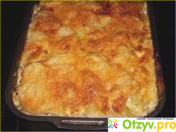 7. Снова выложите слой картошки и посыпьте специями. Залейте запеканку готовой заправкой из сметаны.