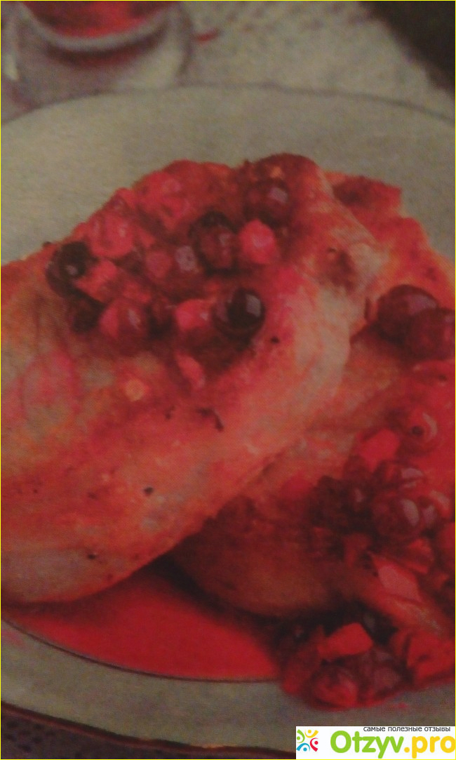 5) выложите мясо на тарелки, полейте острым клюквенным соусом.