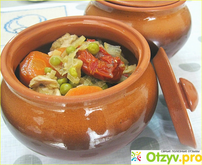 Когда вы соедините содержимое горшочка с приготовленным бульоном, необходимо разогреть духовой шкаф до температуры 200 градусов. После горшок накрываем крышкой и отправляем в разогретую духовку на один час.