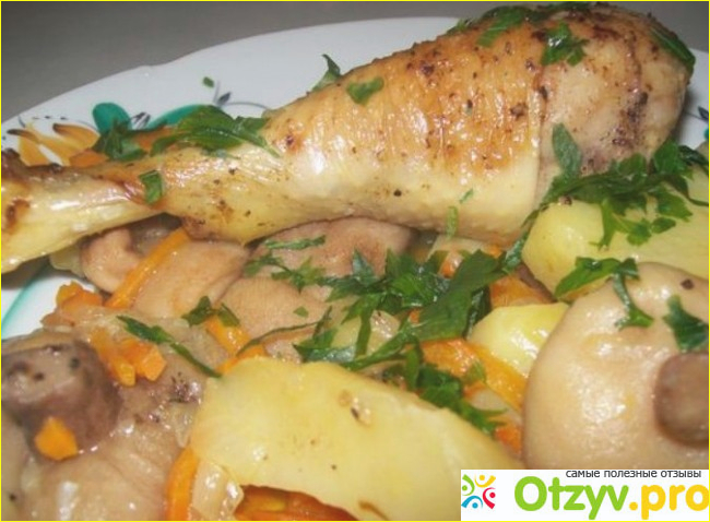 6) В глубокую жаровную выложить куски поджаренного куриного мяса, сверху добавить овощи, залить все компоненты предварительно приготовленным мясным бульоном или кипяченой водой, и накрыть крышкой. Затем жаровню необходимо поставить в предварительно разогретую до + 200* С духовку, и дать мясу с овощами как следует протушиться в течение 1часа 10 минут. Затем духовку необходимо выключить, и дать возможность готовому блюду еще немного постоять в духовке.