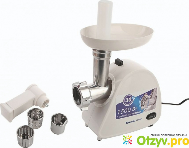 У нашего героя силенок маловато, как не прискорбно, но мощность всего 1500 Вт, более того, производительность наинижайшая, то есть способен обрабатывать... до 600 граммов мяса в минуту!!! Это очень-очень мало, ничтожно мало, особенно если сравнивать с другими моделями мясорубок, которые за одну минуту могут прокрутить до 4-5 килограммов продуктов! Так что выбирая прибор Чудесница ЭМШ-24 вы реально рискуете просто застрять на кухне, пока перекрутите свои три килограмма мяса! Хорошо, что есть система реверса, то есть если в мясорубке застрянет мясо, то прибор позволит прокрутить шнек в обратном направлении.