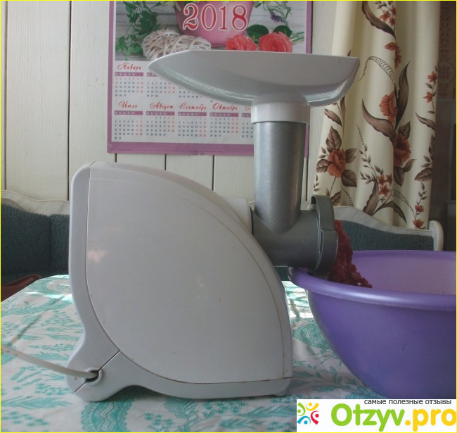 На сборку и разборку уходит не более минуты. Отмывается легко, не следует только при этом применять агрессивные моющие средства, от которых может потемнеть корпус механики, изготовленный из алюминиевого сплава (силумин). Наибольшие проблемы - с решёткой. Её приходится иногда прочищать от застрявшего мяса спичкой, или продувать. Лучше последним пропускать для фарша лук или картофель, если они входят в рецепт приготовления, он "пробьет" решетку, и так её отмывать проще. Мясорубка достаточно мощная, хотя если попадает с мясо с жилами, ей с ним справляться явно не просто, что хорошо слышно по звуку. Реверса (вращения в обратную сторону) у этой мясорубки нет. Если её "забьёт" слишком жилистым мясом и перестанет вращаться подающий шнек, сработает защита и мясорубка отключится. Без такой защиты это привело бы очень быстрому сгоранию двигателя. А вот то, что в таких случаях приходится разбирать и прочищать мясорубку, не есть очень хорошо. Реверс у мясорубки - вещь полезная. Подающая воронка имеет диаметр около 4 см, но лучше мясо для фарша резать маленькими кусочками и подавать постепенно, не перегружая мясорубку. Для жил и костей она, конечно, не предназначена, их следует удалять. В комплекте мясорубки 3 сменных решетки: с диаметром отверстий 3 мм для очень мелкого фарша, среднего размера (4,7 мм) для мелко нарубленного фарша и решётка с крупными отверстиями,(7 мм), для крупного фарша. Работает она достаточно громко, при работе шумит примерно как пылесос. Есть возможность приобрести отдельно дополнительные приспособления к ней, например, для шинкования, но я такими никогда не пользовался, поэтому сказать о них ни чего не могу. Возможно, если бы я сейчас покупал новую мясорубку, я бы и выбрал другую модель, лишенную перечисленных выше недостатков, несмотря на более высокую цену, не знаю. Но в целом могу сказать, что эта мясорубка достаточно хороша для своей ценовой категории, а уж от советской ручной мясорубки, которой мы пользовались до этого, отличается, как небо и земля.