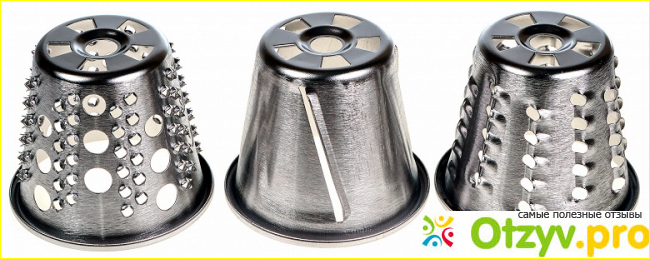Для этой овощерезки не подойдёт лоток для мяса. В комплекте – три тёрки конусообразной формы: шинковка, средняя и мелкая терка, предназначенная для драников.