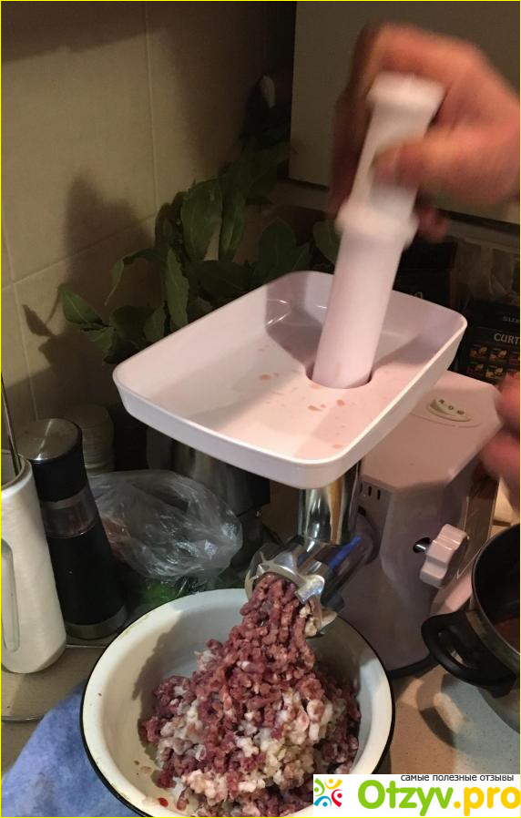 Есть пластмассовый толкатель. Чтобы мясорубка была абсолютно безопасной и не было никакой возможности повредить пальцы, отверстия для поступления мяса очень узкое, а для удобства в работе есть толкатель. Если что то застревает, можно продавить.
