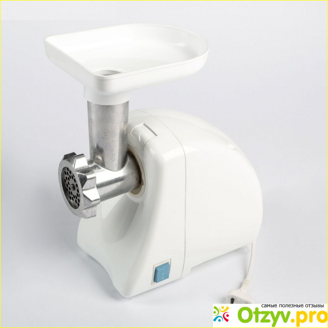 Слева на корпусе находится включатель-включатель в форме шара с выемкой в одну четверть (очень удобно для пальцев), скорость одна, на подошве противоскользящие накладки (не прыгает по столу во время процесса), металлическая комплектация (режущий и подающий инструмент: решетки, шнек) почти в точности повторяет привычную ручную мясорубку.