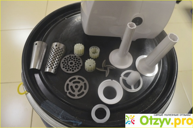 В комплект согласно инструкции входят моторный блок, чашка, толкатель, две насадки для колбасок и кеббе, предохранительные колпачки. Вес собранного изделия около четырех килограммов. Покрытие блока, чаша и толкатель изготовлены из пластика. Насадка изготовлена из силумина, ножи и решетки - из металла.