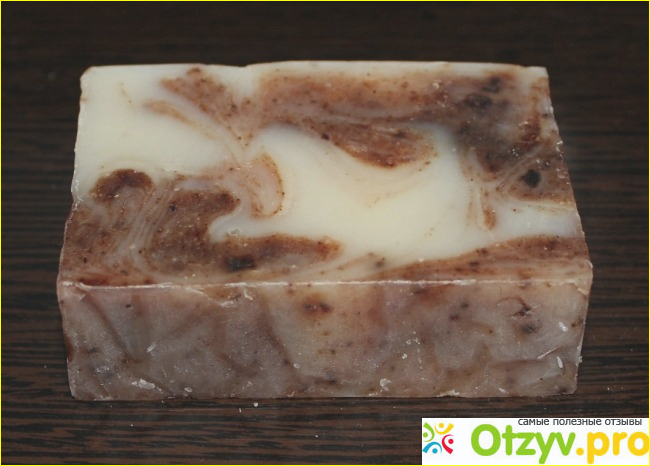 Само мыло симпатичное, не однородной текстуры, с разводами. Скорее это даже мыло-скраб, так как частичек (скорлупа кедрового ореха) много и они довольно-таки ощутимы. Иногда попадаются ягоды можжевельника, но они выполняют скорее декоративную функцию, нежели практическую.