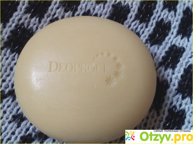 Мыло у меня круглое, желтовато-бежевого цвета. Выбит на лицевой стороне логотип бренда.