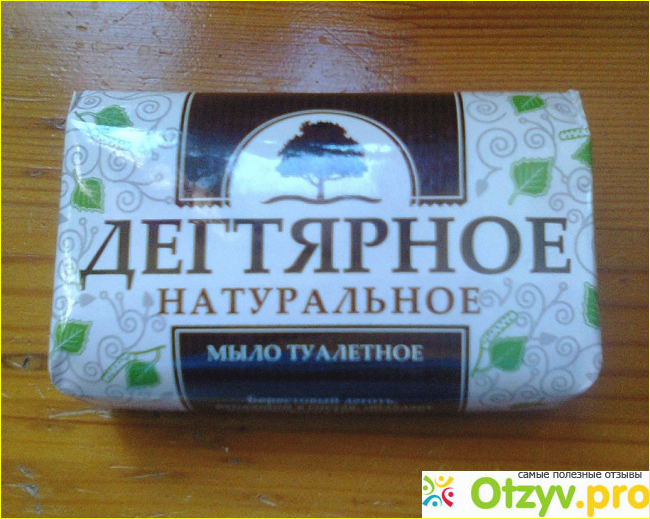 Продается мыло в глянцевой, гладкой упаковке, оформлено симпатично довольно-таки, на упаковке изображены березовые листочки и крупными буквами написано название - Дегтярное.