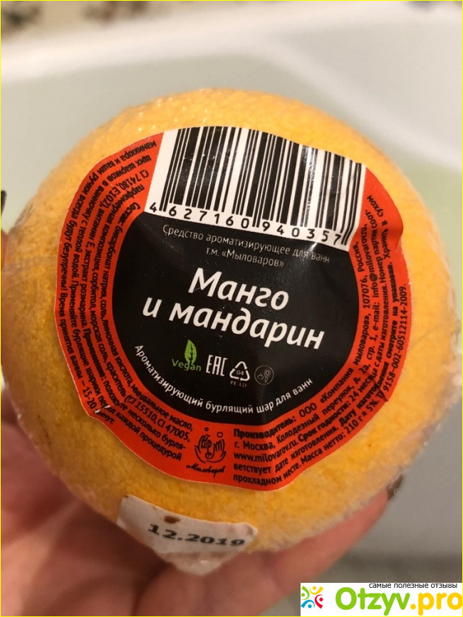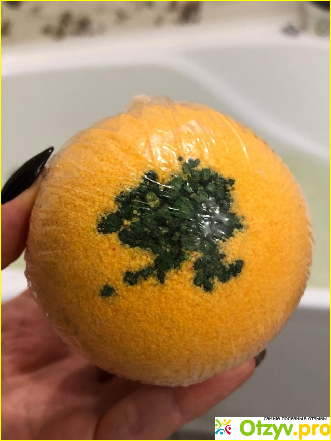 Я принимаю ванну пару раз в неделю, и когда процедура носит чисто эстетическйи характер я предпочитаю использовать цветные бомбочки. Шар манго и мандарин внешне очень привлекательный, добротный, и выглядит существенно дороже заявленной цены. Это настоящая порция хорошего настроения. Основной цвет что-то между желтым и оранжевым, цвет карри. В центре есть вкрапление травянисто-зеленого. Очень летнее настроение, чарующая красота.