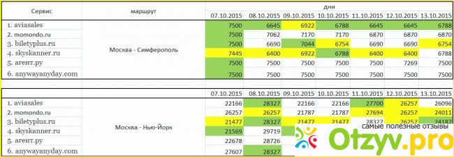 Итак, что я сделала? Я промониторил цены за неделю на 2 популярных направления. Что из этого получилось, смотрите вот в этой таблице. Самые недорогие варианты выделены желтым цветом. Зеленые - чуть менее выгодные. Поэтому можете даже сохранить себе на компьютер изображение, прикрепленное к данному отзыву.