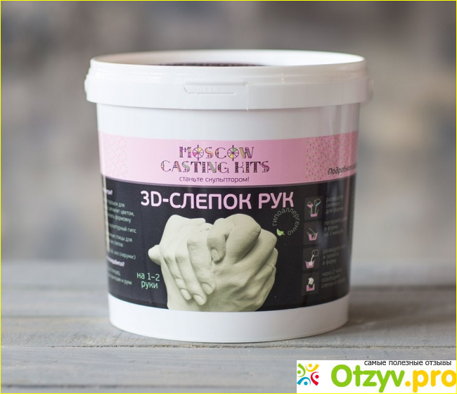 Итак, передо мной была упаковка в виде ведра для замешивания смеси весом в целых 2 кг! Внутри нашелся гипс, масса для лепки и спицы, и конечно инструкция по работе с продуктом. Работа простая, но в то же время новая и очень занимательная. Для начала нужно создать форму из силикона, в которую затем будет погружаться гипсовая масса, которая и будет нашим конечным слепком. Продукт предназначен только для взрослых, так как требует точности и внимания, чтобы конечный результат получился действительно заслуживающим внимания и радовал многие годы.