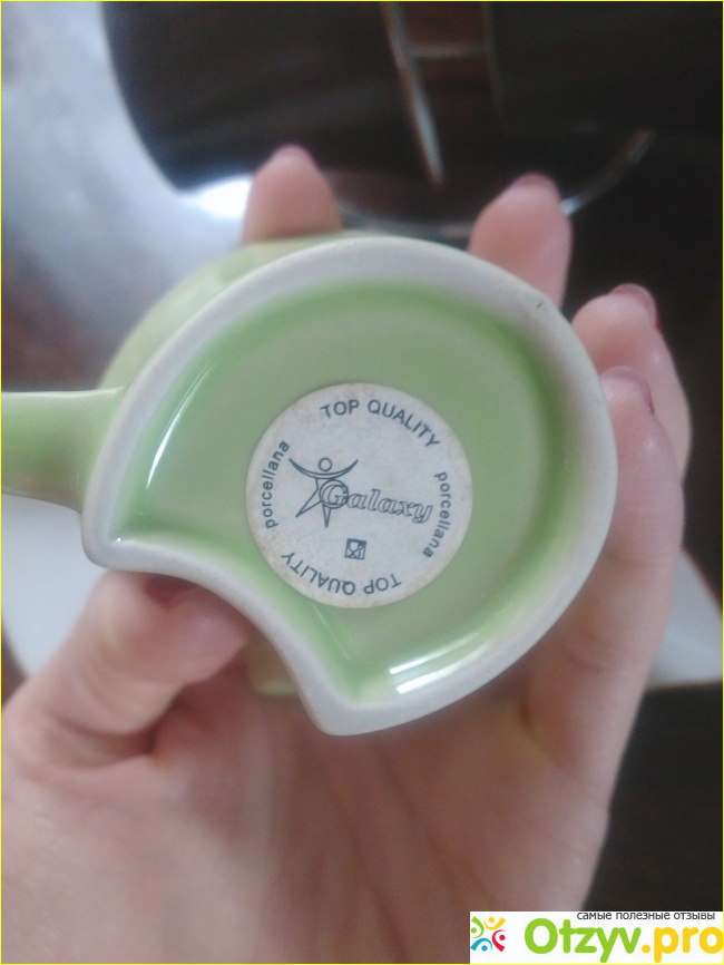 На донышке каждой чашечки и каждого блюдечка есть небольшого размера круглая бумажная наклейка, на которой написано название торговой марки - Galaxy.