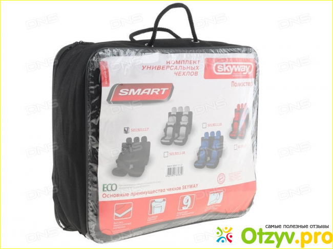 На передние сиденья SKYWAY Smart имеют литую схему надевания, крепятся при помощи резинок и крючков. Хорошо, что в спинку заднего ряда вшиты три молнии, они позволяют пользоваться функцией раскладки сидений и подлокотником.