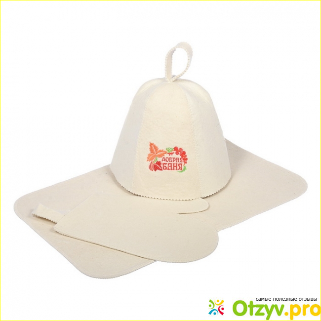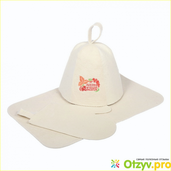 В описании сообщалось, что материал — войлок, 100% шерсть. По идее, для бани и нельзя применять другую материю, ведь все остальное при нагревании будет издавать нехорошие пары.