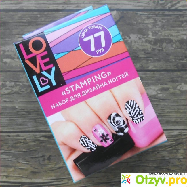 Стемпинг – это нейл-арт для ногтей при помощи штампа, скребка, диска или пластины и лака. В данном наборе есть первые три вещи. Декоративный лак в нем отсутствует. Вся продукция упакована в одну коробочку, которая стоит 77 рублей. Есть несколько наборов Stamping из линейки Lovely, отличающихся только рисунками на дисках.