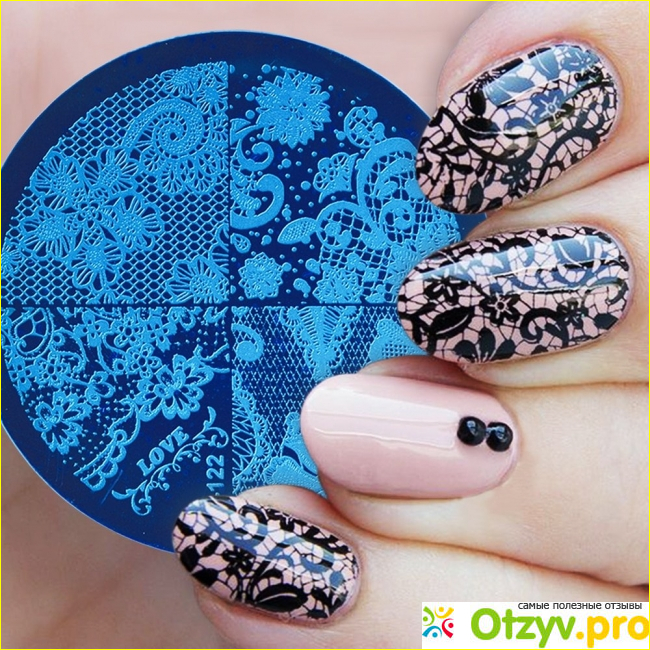 Пластинка трафарет маленькая, круглая, на ней четыре вида рисунка. Можно приловчиться вычленять только те части, что именно нужны. Я пока предпочитаю использовать гель-краску или густые лаки, так чтобы рисунок не растекался и я бы успевала его перенести точечно. После использования хорошо очищается обычным клинсером. Я человек довольно аккуратный и моя пластинка всегда сохраняется чистой и готовой к использованию.