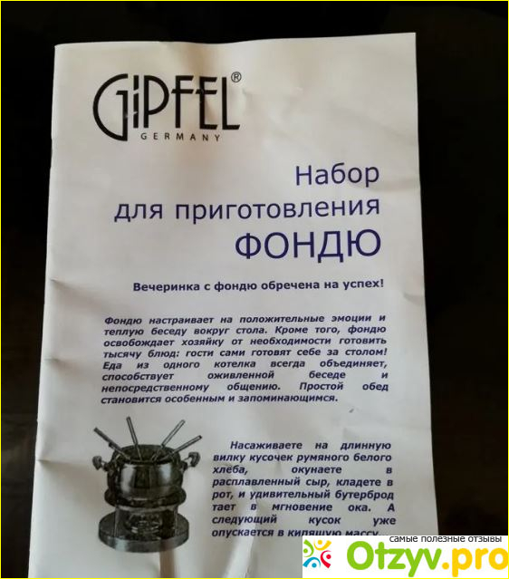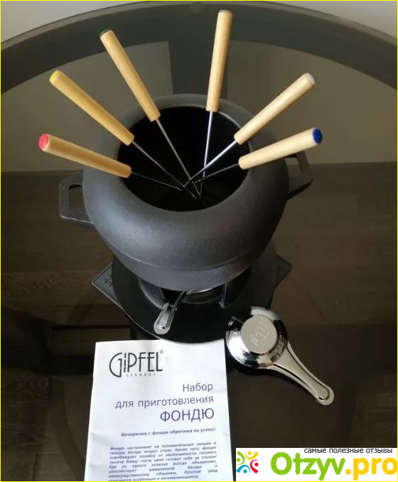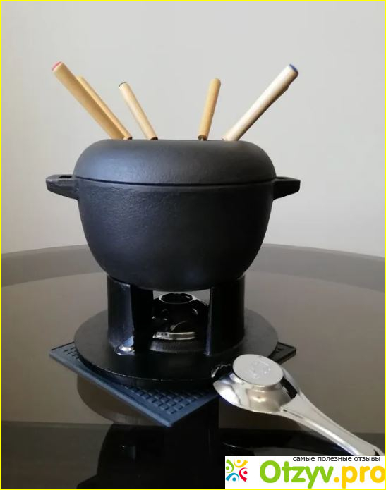 Чугун прекрасно отмывается, как от приставшего сыра, так и шоколада. Похоже, что у него есть дополнительное покрытие, хотя и сам чугун в процессе эксплуатации покрываются тонкой плёночкой, которая служит надёжным антипригарным покрытием. Кастрюлька увесистая и крепкая, её можно безболезненно ставить на раскаленную плиту. Так как чугун накаляется не сразу, для сырного и мясного фондю, сыр, или масло лучше разогреть сначала на плите, а потом уже поддерживать его в горячем виде с помощью горелки. Если изначально начинать готовить фондю на горелке, то ждать расплавления сыра придется долго. Но, если вы собрались делать это где-нибудь в беседке или выехали на природу с этим набором, то займитесь разогревом заранее перед едой. Лучше всего для горелки приобретать специальный гель. Но он быстро высыхает, поэтому не берите его по много. Для сырного или шоколадного вполне подойдет и небольшая свечка в виде таблетки. Кое где в продаже можно найти даже сухой спирт. Понравилось, что к этой фондюшнице прилагается книжка с рецептами, там можно почерпнуть что-нибудь интересное.