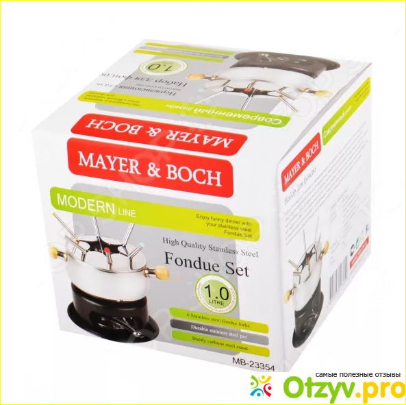 Одним словом, хочется сказать, что для тех, кто не единожды решил опробовать что это такое, кому действительно всерьез нравятся различные рецепты из раздела "фондю", тем пользователям желательно бы приобрести специальную посуду для приготовления данного швейцарского национального блюда. Предложений в различных магазинах техники и товаров для дома в наше время имеется очень много, в том числе и набор для фондю от фирмы Mayer&Boch модель MB-23354.