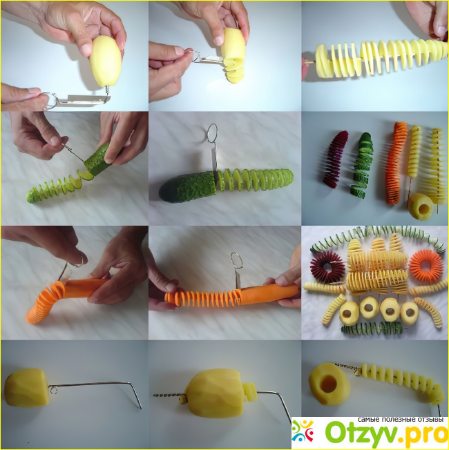 Вторые два ножа также подходит для приготовление различных спиралек из картофеля, огурцов и прочих продуктов. Прикладывать можно фантазию по-разному, как захотите. В картошке получаются аккуратные спиральные дырочки, которые можно нафаршировать различной начинкой. Вытащенные спиральки можно поджарить или сделать из них картошку фри. В целом фантазировать можно кому, как нравится.