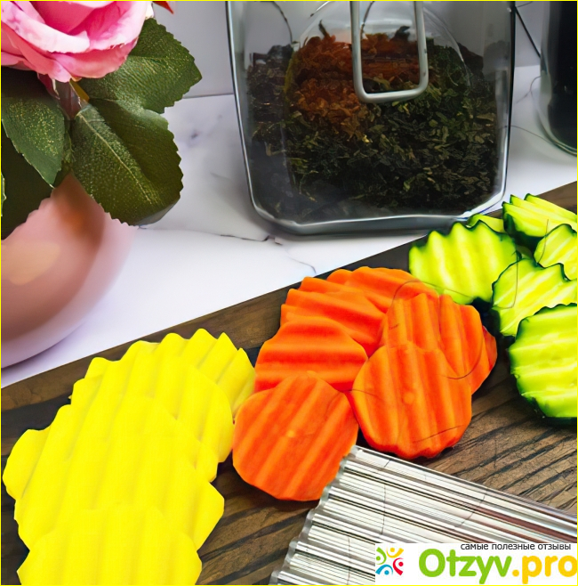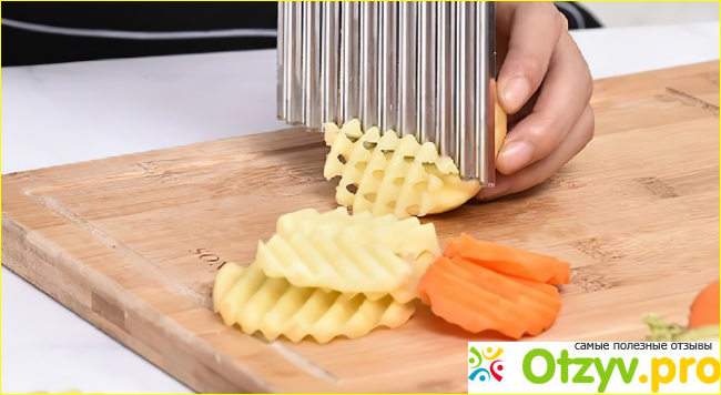 С помощью волнистого ножа можно неплохо приготовить нарезку из овощей. Хорошо нарезаются маринованные и соленые огурцы, можно порезать небольшую отварную свёклу, которую потом можно помазать майонезом с чесноком. Из свежих овощей можно порезать огурцы или помидоры. Правда свежие помидоры получается порезать более или менее аппетитно, если они твердые, и то не все, а желательно удлиненной формы. Обычно удаётся их разрезать пополам, чтобы на разрезе получилась волнистая линия. Если стараться покрошить, то они больше давятся. Для украшения заливного или холодца хорошо получается порезать колечками вареную морковку и варёные вкрутую яйца. Для колбасы этот нож подходит плохо, если только для более мягкой, вареной. Для другой уже требуется крепкая мужская рука. Также, если вы любите готовить картошечку фри для своих детей, то её можно приготовить волнистой. Дети любят различные незамысловатый формы, и едят такие блюда уже с большим удовольствием