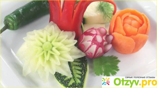 Данный набор предназначен для того, чтобы можно было создавать украшения из таких продуктов: морковь, белая редька, редис, огурцы, кабачки, лук порей, тыква, яблоки, манго, груши, дыня и другие.