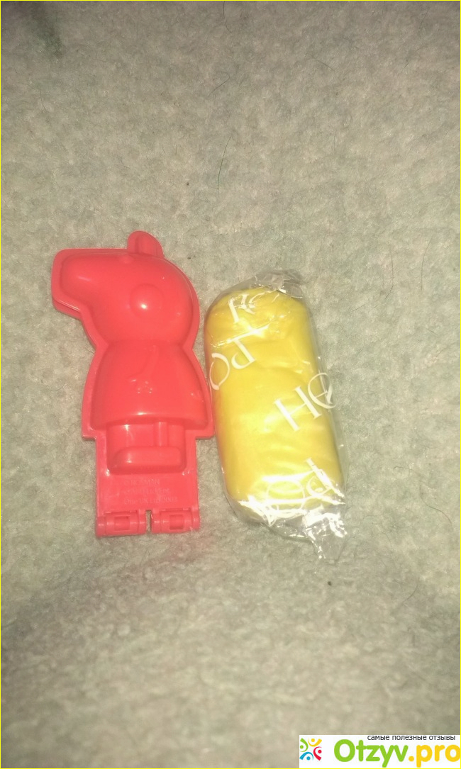 1) Большая формочка 3 D красного цвета- позволяет сделать объёмную фигурку из теста свинки " Пеппы" . Формочка имеет маленькие отверстия, которые маленький ребёнок не может без помощи взрослого заполнить тестом. Не особо легко и выдавить фигурку из формочки.