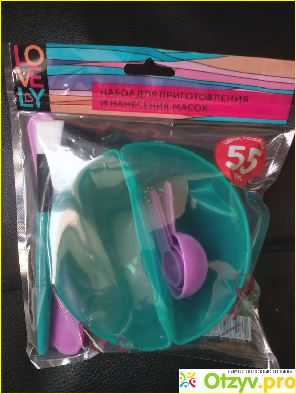 Итак, в наборе всего 6 предметов : мисочка для приготовления масок, три мерные ложечки разных размеров, кисточка и шпателек для нанесения маски.