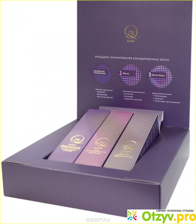 Добрый день! Хочу поделиться отзывом о наборе для процедуры экранирования поврежденных волос "Estel Q3 BLOND". О упаковке и его содержимом: интересная упаковка, есть инструкция по применению, также три тюбика по 100 мл - кондиционер, масло, спрей - блеск. Настоятельная просьба до применения внимательно изучать инструкцию.