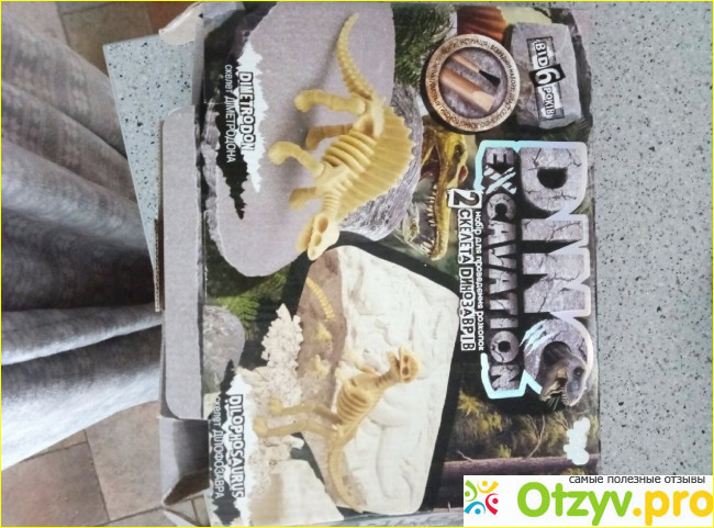 Ребенку нужно самостоятельно раскопать скелеты динозавров. В нашем наборе было указано 2 скелета. Красивая коробка, внутри гипс, в котором собственно и спрятаны фигурки. Инструкция