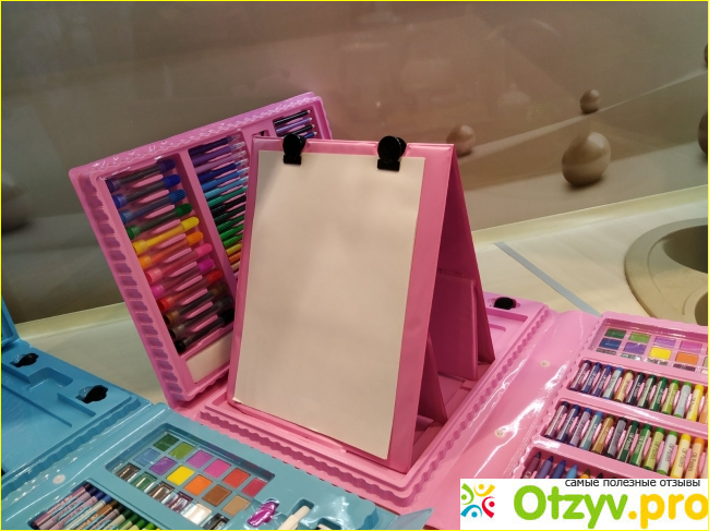 Набор заказала в интернет-магазине, а так, как было сложно определиться с цветом чемоданчика по моей просьбе курьер привез два комплекта в розовом и голубом цветах на выбор. Больше понравился розовый кейс из 208 предметов для творчества.