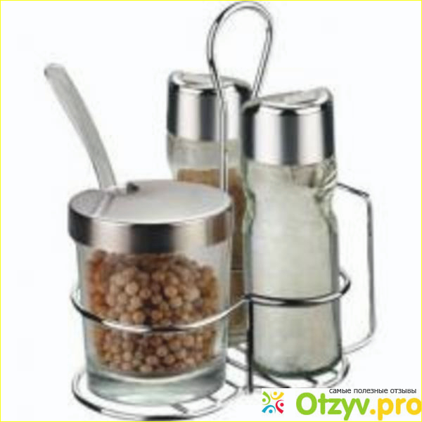 В данный набор входят четыре предмета: солонка, перечница, емкость для сыпучих тел и завершает все подставка, выполненная и нержавеющей стали. Довольно удобно, что баночки выполнены из стекла: всегда есть возможность наблюдать за содержимым и если надо своевременно наполнять их. Стекло довольно хорошего качества, в нем нет икаких неровностей или вздутий, просто прозрачная, гладкая поверхность. Дно сделано с утолщением, что сказывается на устойчивости, баночки не упадут даже без подставки. Правда как ндостаток стекла добавили слишком много, что сказалось на удобстве. Полные емкости довольно тяжелы и увесисты. Щели же в крышечках излишне узки и склонны к забиванию изакупориванию. К примеру, чтоб воспользоватся перечницей нужно будт изрядно потрясти. А соль в солонку подойдет только мелкая. Я же, нзнаю почему, люблю крупную, но в солонку такую не засыплешь, ведь она не будто проходить через щели. Правда толстые стенки можно с другой стороны расценить как плюс: дже еси вы уроните емкость, есть гарантия что она не разобьется, правда если пол у вас не каменный.