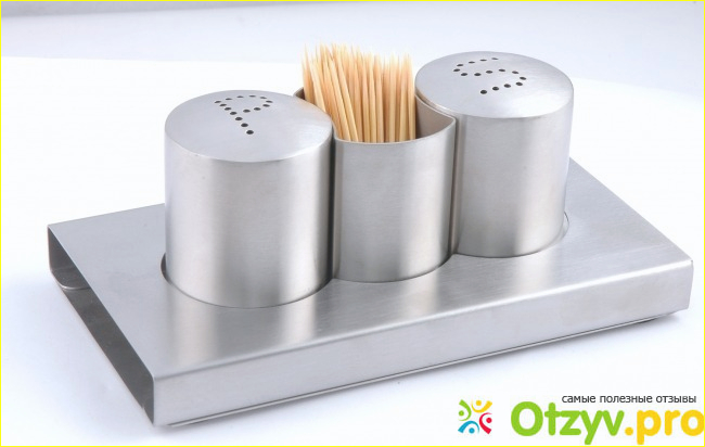 Материал корпуса данного набора из стали, который нам полностью подходит по дизайну. Состоит из трёх предметов: двух ёмкостей для специй, стилизованных под солонку и перечницу, а также держателя для зубочисток.
