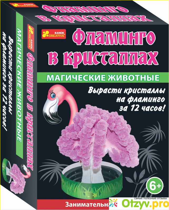 Набор для юных исследователей "Фламинго в кристаллах" от Ranok creative относится к серии "Занимательная химия". На упаковке стоит маркировка "6+", но моему малышу было 5 лет, когда нам подарили этот набор и мы играли ним с удовольствием. В картонной упаковке содержится: туловище фламинго из картона, бумажная трава, подставка, специальный раствор в пакетике.