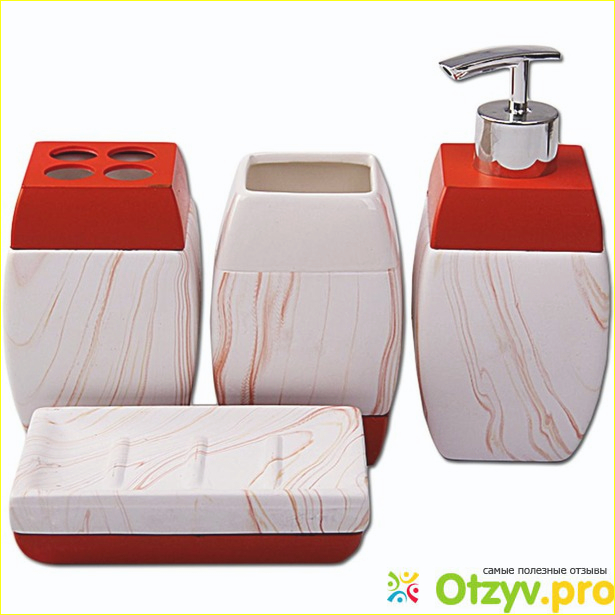 Данный набор имеет очень красивое цветовое сочетание. В каждом элементе есть красный цвет и часть похожая на мрамор. Мраморный рисунок также сделан в соответствующих тонах, чтобы две части между собой сочетались и гармонировали. Комплект смотрится очень стильно и красиво в интерьере.