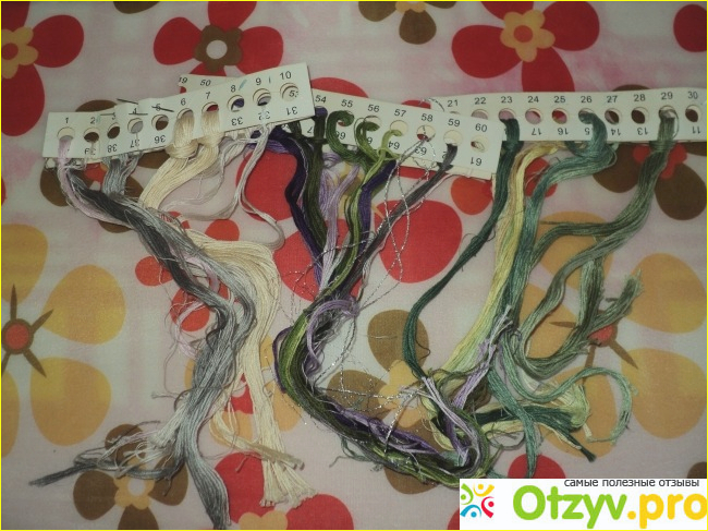 Нити мулине из набора хлопковые, 30 цветов. Из всех нитей попался какой-то вредный зеленый оттенок. Нить часто рвалась и путалась. С остальными цветами никаких неприятностей не происходило.