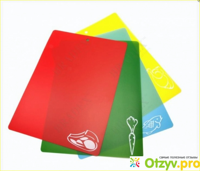 Итак, в данном наборе находится четыре дощечки разных цветов: желтого, красного, салатового и синего. На одной дощечке мы режем овощи и фрукты, на другой - разделываем сырую рыбу и мясо, на третьей режем хлебобулочные изделия, а на четвертой - уже готовое мясо, яйца и т. д. Мне очень нравится, что на дощечках нанесены рисунки еды, так что доску для рыбы вы не перепутаете с доской для фруктов. Сами разделочные доски сделаны из пластика. Я слышала такую информацию, что пластик не впитывает столько микробов и остатков продуктов, как дерево, поэтому в этот раз мы решили купить именно пластиковые разделочные доски. Кстати, производителем данного товара является фирма Bradex. А страной-производителем - великий и могучий Китай!