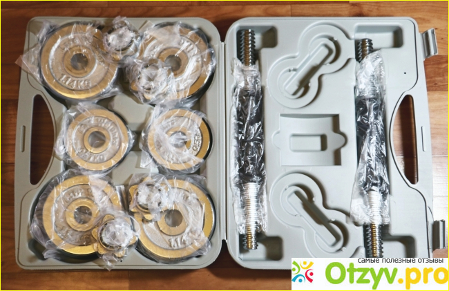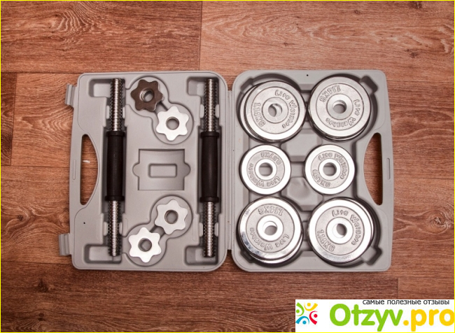 Открыли мы кейс и нашему взору предстало вот что. Муж даже издал клич, похожий на индейца. В нём находилось: набор блинчиков с развесовкой 1,14 кило и 0,57. Вторые как раз были для меня и их было четыре штуки, а первых - восемь. Имелись два гантельных грифа с резьбой под замки, которые накручиваются на них и фиксируют блины на нём. Всё эти предметы были в плёнке. На коробке была крепкая ручка.