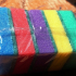 Продаются они в простенькой целлофановой упаковке, через которую видны сами губки. В упаковке их пять штук и они все разного цвета: зеленого, желтого, красного, фиолетового и синего. Каждая губка небольшого размеров 8 х 5 х 2.5 см. Она удобно лежит в руке, работать ей легко и комфортно.