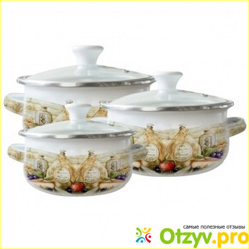 Выполнена посуда из стали с эмалированным покрытием, крышки стеклянные с пароотводами.