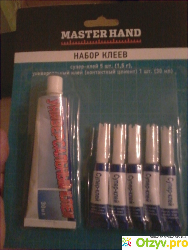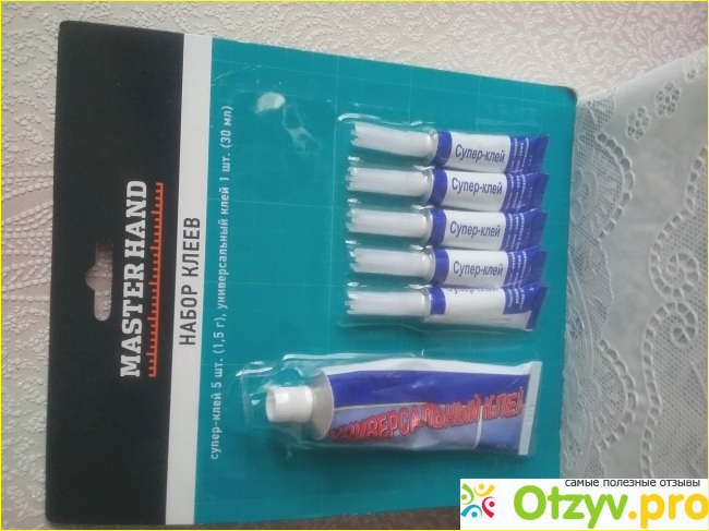 В магазине "Fix Price" муж купил упаковку клеев " Master Hand", в которой находилось целый комплект тюбиков: 1 универсальный клей, в котором 30 мл и 5 тюбиков, в которых по 1,5 грамма клея. Стоимость данного набора 45 рублей.