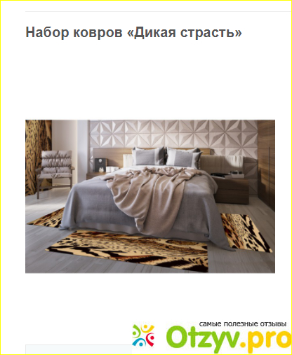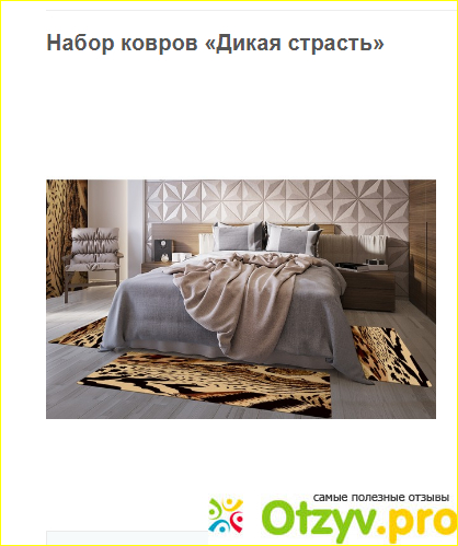 Набор ковров Дикая страсть — это возможность внести как постоянную дерзкую нотку в элемент декора комнаты, так и быстро украсить, к примеру, спальню, добавив в нее атмосферу жара страсти и соблазна.